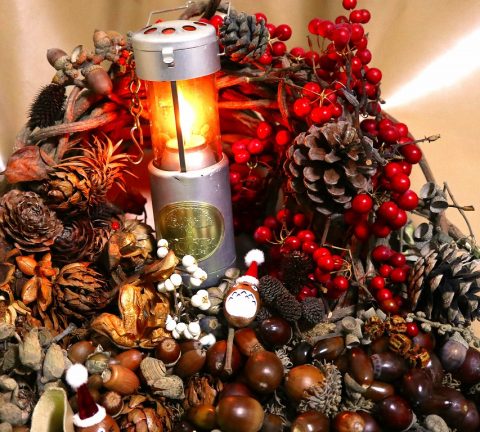 赤い実はサルトリイバラ、白い実はナンキンハゼ、ピカピカのドングリは、シリブカガシ、我々森遊会のロゴマークはこのドングリをもとにしています。