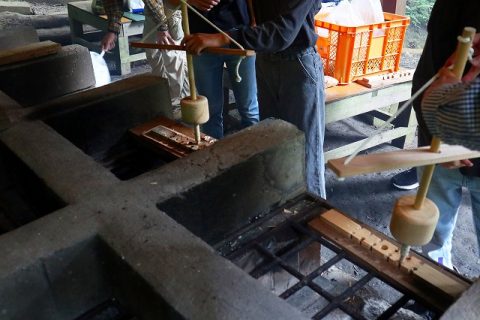 さて、舞ぎり式の火おこしは、なかなか大変で火種ができません。慣れている保護者のかたが火種をつくってくれたのですが、私の不手際でせっかくできた火種を消してしまいました。